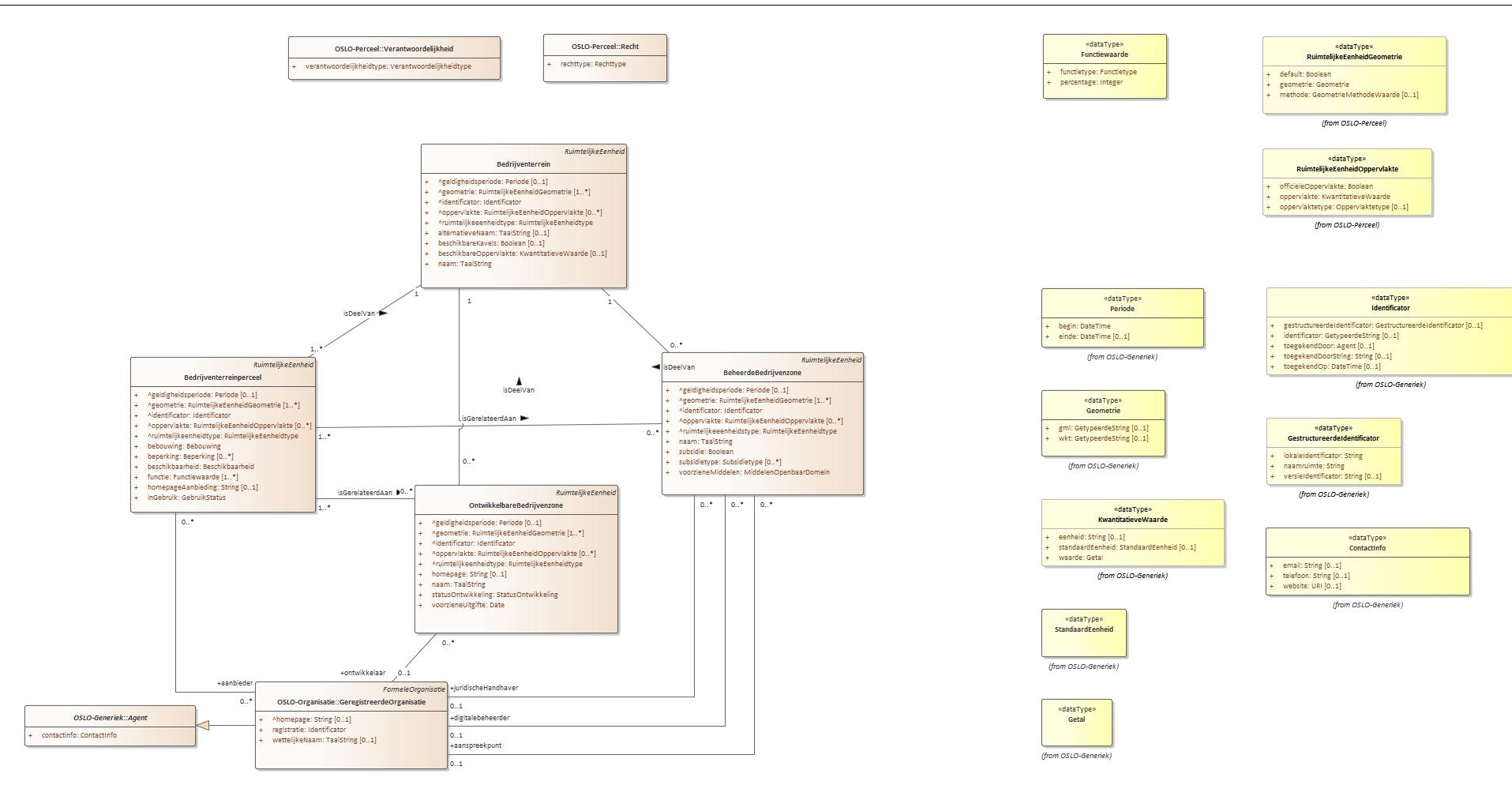 Functiewaarde | 1..* | De functie geeft de (verschillende) functies aan die men kan terugvinden op het Bedrijventerreinperceel en het percentage van het perceel dat gedekt wordt door elke functie. | Modellering geïnspireerd op INSPIRE HILUCS value en HILUCS percentage. | |